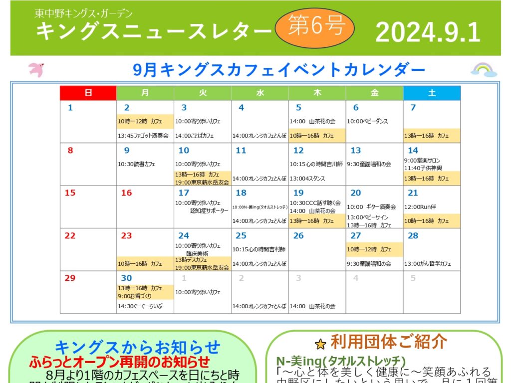 【東中野KG】キングスニュースレター9月号 こんにちは✨東中野キングス・ガーデンです。9月分のニュースレタ…