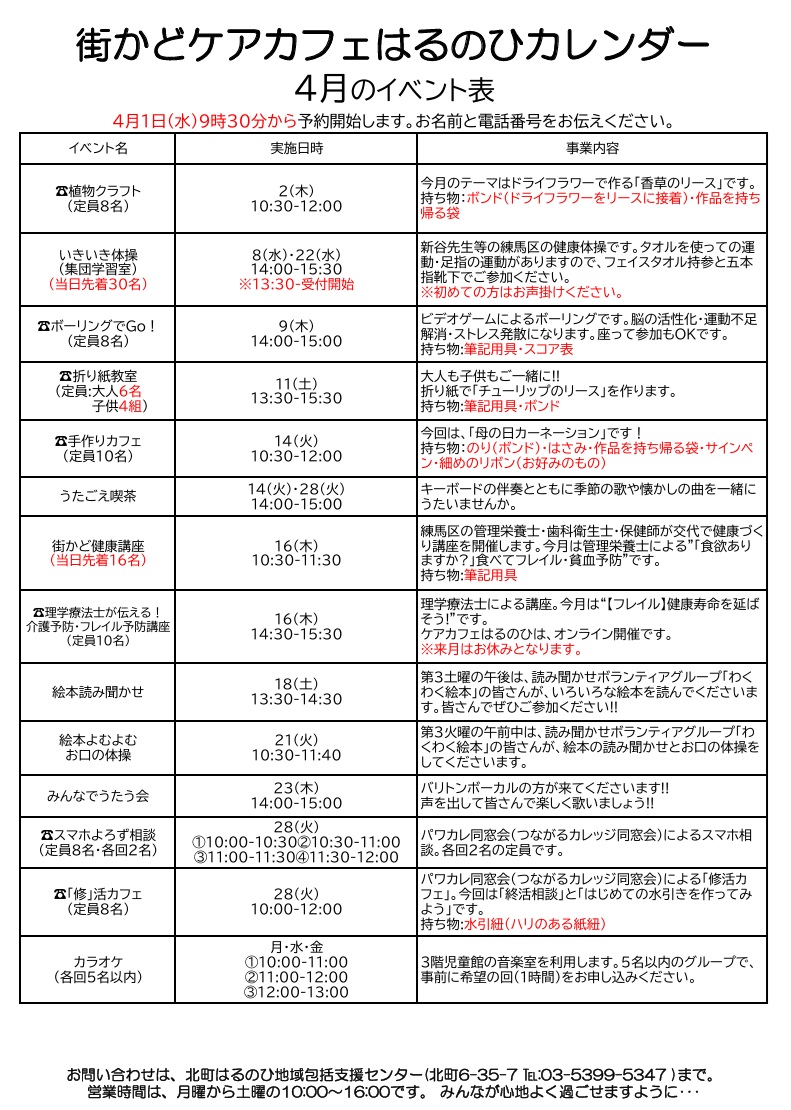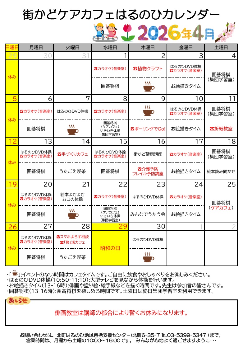 🌸常設型街かどケアカフェはるのひ🌸4月日程↓