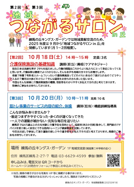 【練馬の丘KG】(10/18&20)第2回&第3回地域つながるサロンin丘「介護保険施設の基礎知識」「筋トレ事業のサービス内容の紹介、体操」