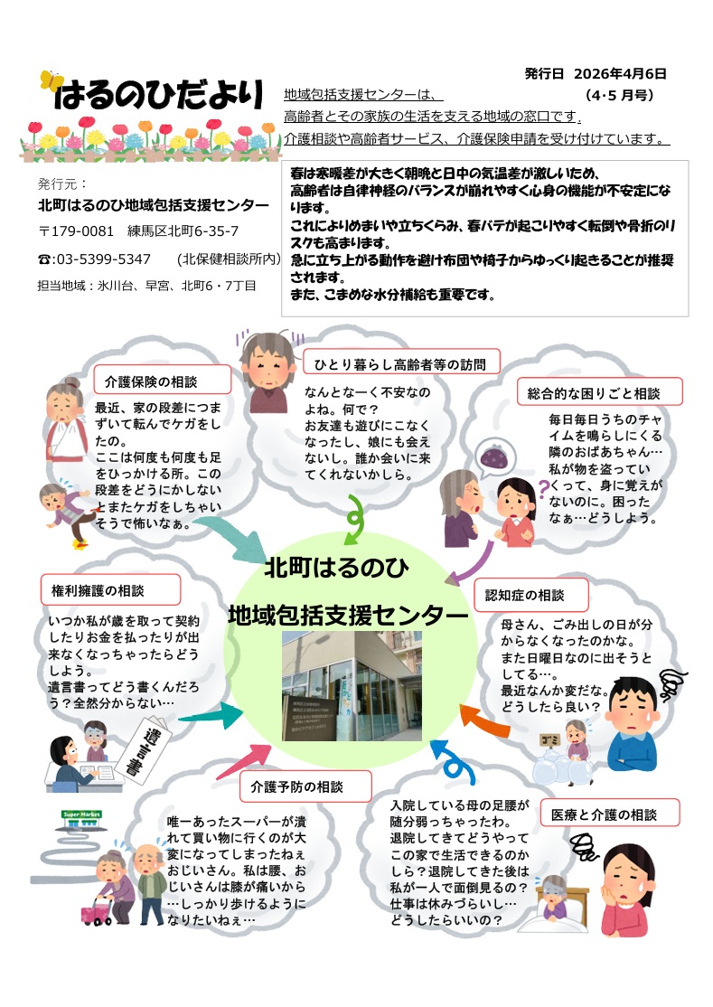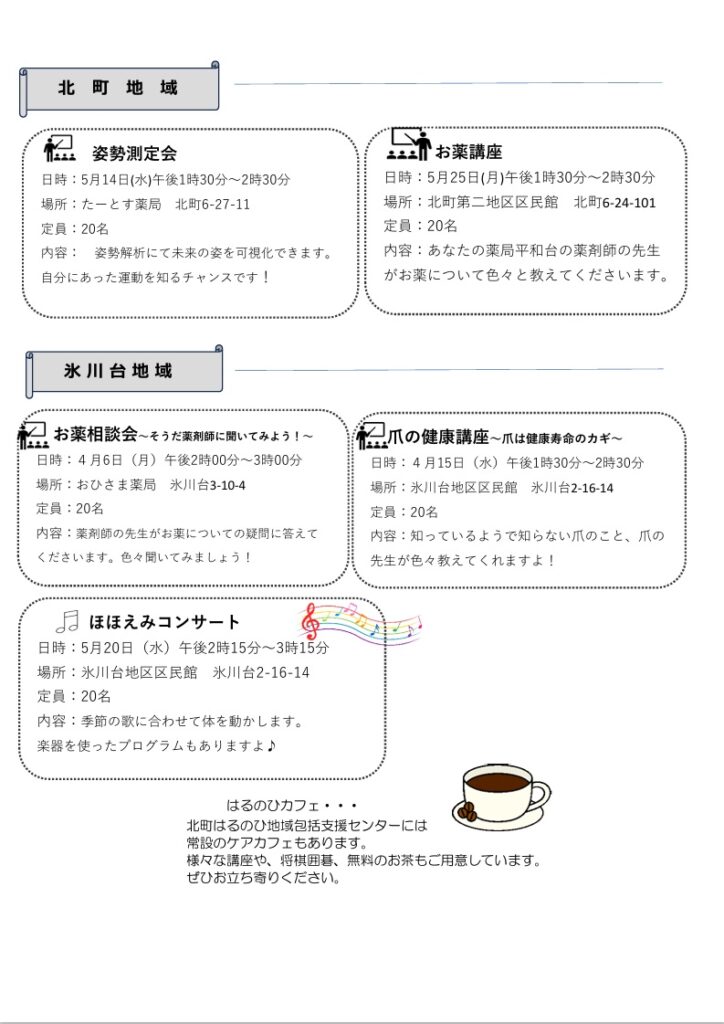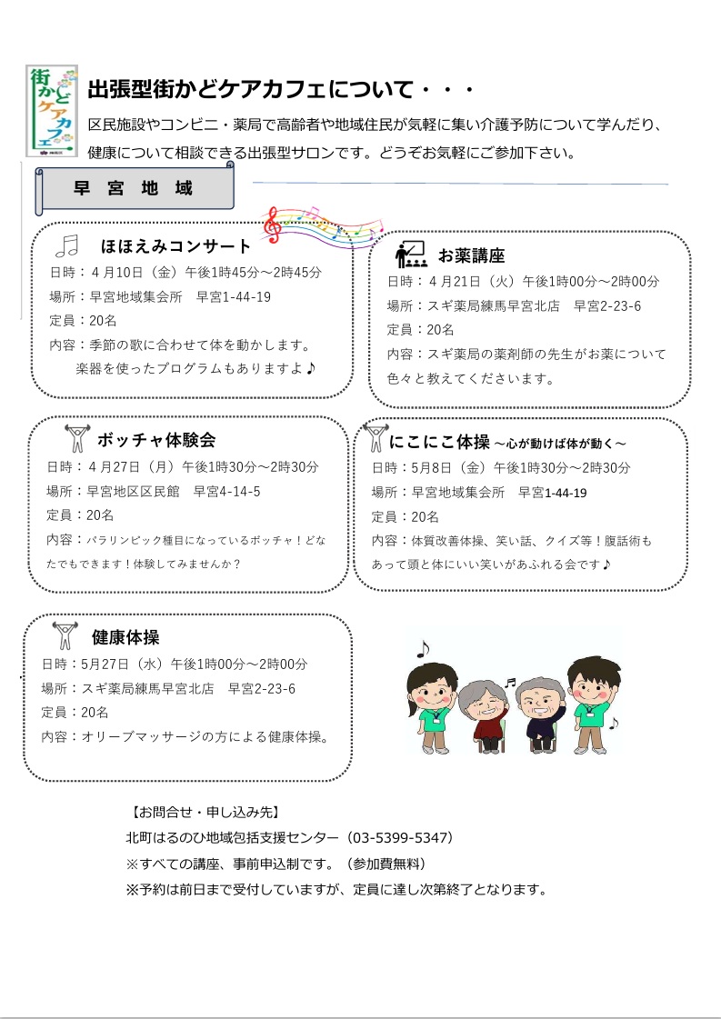 【出張型まちかどケアカフェ】開催!4月から5月の出張型まちかどケアカフェの開催予定表を作成しました。詳細はチラシをご覧ください!みなさまぜひご参加、お待ちしております✨ 申し込みやお問い合わせは北町はるのひ地域包括支援センターまでお願いいたします👀(担当:細島 渡辺 03-5399-5347)